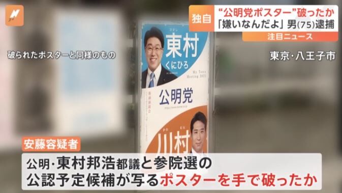 捜査関係者によりますと、器物損壊の疑いで現行犯逮捕されたのは、無職の自称・安藤康博容疑者(75)です。安藤容疑者は、八王子市丸山町の掲示板に貼られていた公明党の東村邦浩都議と今年夏の参院選に出馬する公明党の公認予定候補が写るポスターを手で破った疑いがもたれています。