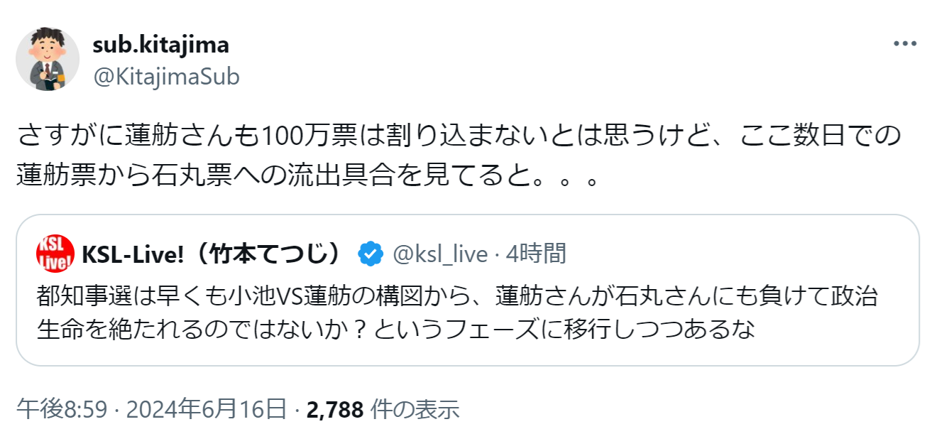 情勢調査でこの数日で20万票が蓮舫から石丸に流れたらしいな