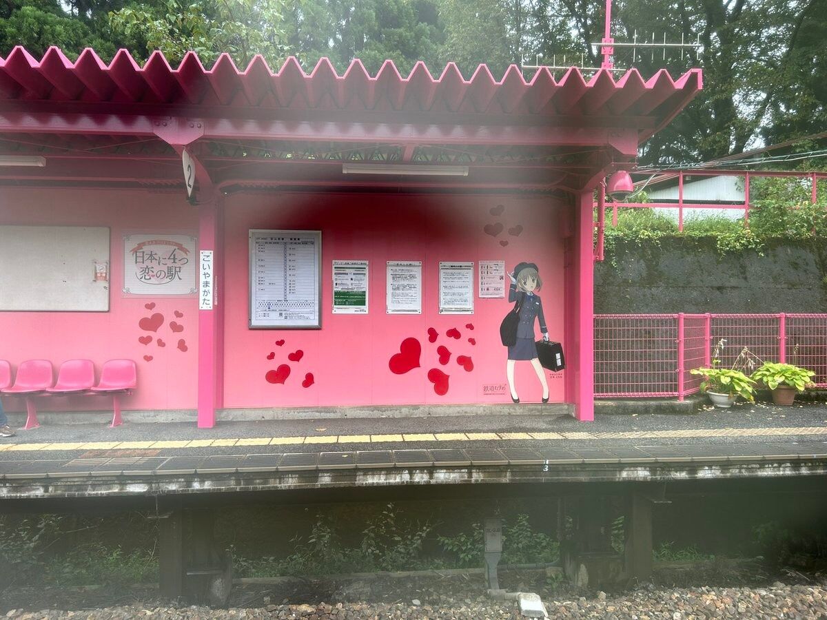 駅は壁面や屋根だけでなく、ベンチ、フェンス、ごみ箱までピンク色に塗装され、壁面には真っ赤なハートと、