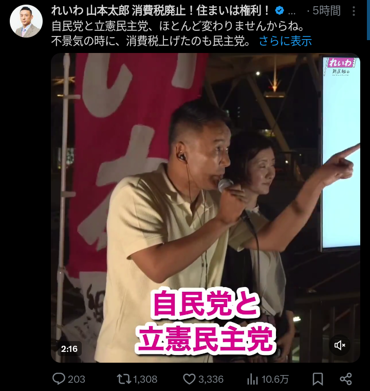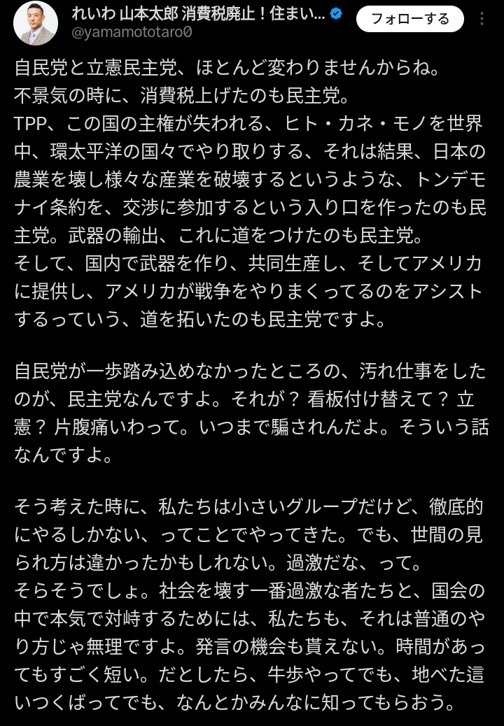 山本太郎「自民党と立憲民主党、ほとんど変わりませんからね。」「不景気の時に消費税上げたのも民主党」「武器の輸出、これに道をつけたのも民主党」