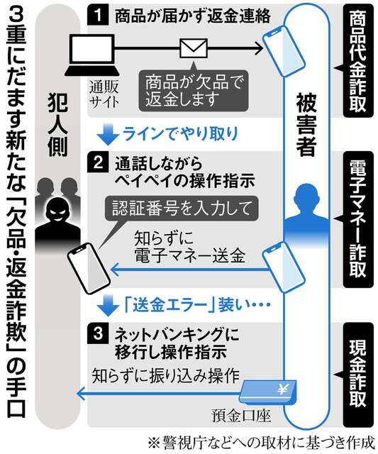 ■通販サイト装う 《先日ご購入いただいた商品は一時的に欠品しております》 警視庁によると今年5月、通販サイトでアイドルの交流イベントのチケットを購入した40代女性に、こんなメールが届いた。女性は文面に従い、支払ったチケット代1万5千円の返金を受けようと、業者を名乗る人物とLINE(ライン)で、やり取りを始めた。 業者がスマートフォン決済アプリ「PayPay(ペイペイ)」で返金すると説明したため、女性は業者と通話しながら、ペイペイで「認証コード」と称する数字などを入力。すると知らない間に電子マネー約25万円を送金させられていた。 業者はその後も「エラーで返金できない」などと、今度はインターネットバンキングのサイトに誘導。指示通りに操作した女性の口座から計980万円が送金された。女性は警視庁に対し「指示通りやればお金が返ってくると思っていた」と話しているという。 ■年齢、性別関係なく 警視庁捜査2課によると、こうした欠品や返金を装う詐欺被害は令和5年ごろから確認されるようになり、最近になって急増。被害者の年齢層は10~70代と幅広く、性別に関係なく被害が拡大しているという。 被害のポイントは偽の通販サイトだ。アマゾンのような大手サイトを装うものではなく、個人や小規模事業者を装い、書籍や洋服、楽器、フィギュア、DVDなどの販売を扱うものが確認されている。他のサイトよりも格段に安いなどの特徴があるという。 国民生活センターにも被害相談が多く寄せられている。センターによると、詐欺サイトは、①ブランド品やメーカー品などが市場価格より極端に安い②不自然な日本語表記③サイト内に返品のルールや事業者の情報が記載されていない-などの特徴がある。業者とのやり取りが発生してしまった場合について、担当者は「相手から『○○ペイで返金します』という言葉が出たら、まず詐欺を疑い、当センターや警察に相談してほしい」と呼びかけている。(外崎晃彦)